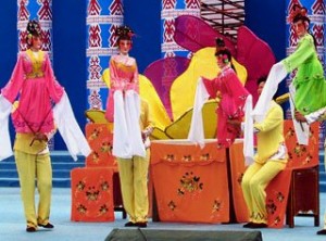 Кукольный театр (на китайском 木偶戏 muouxi, Муоуси) от китайского 木偶 – muou, что в переводе означает «деревянная кукла». О происхождении кукольного театра говориться в традиционной китайской песне. Однажды император Му государства Чжоу (около Х века до нашей эры) возвращался с великой охоты с гор Куньлуна, увидел представление в исполнении плотника Яньши, который был известен во всем государстве Чжоу – деревянные куклы, который изготовил сам Яньши в его руках плясали и пели. Первое упоминание о кукольном театре, как о самодостаточной развлекательной единице, датируется временами династии Хань (206 год до нашей эры – 220 год нашей эры). Тем не менее кукольному театру уже более двух тысяч лет. Китайские кукольные выступления бывают трех видов: кукла с управлением специальными спицами, марионеточные куклы и куклы-перчатки. По сей день самым распространенным видом кукольного театра в самом Китае остается первый вариант с использованием спиц-рычагов. Рост кукол обычно не превышает одного метра, кукловод поднимает куклу, одной рукой управляя ее телом, а второй – парой спиц, которые отвечают за движение кукольных рук. Ноги кукол, обычно, не видны. От кукловода требуется специальны подготовка и сноровка, так как ему нужно не только держать, но и перемещать по сцене куклу весом в два-три килограмма в течение продолжительного времени. Куклы-марионетки представляются зрителям во весь рост, все части тела куклы подвижны, и приводятся в движение с помощью проволоки, которая протянута от каждой части кукольного тела к мосту, скрытому от зрителей, с помощью которого кукловод управляет всеми ее движениями. Куклы-перчатки весьма похожи на русскую куклу Петрушку, самые маленькие из кукол, в высоту не превышают 20 сантиметров.